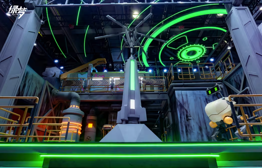 本届萤火虫漫展,《绿梦:时空之声》为观众带来现场最具末日科幻美感的置景,展台以展现后灾难时代的人类文明为核心设计理念,造型融合工业朋克与废土美学,呈现出极具辨识度的视觉风格——半空中呼啸而过的有轨电车,复古的机械框架结构,搭配锈蚀钢板、管道齿轮与发光线路,营造出末世都市中顽强运行的工业基地氛围。展台整体布景层次丰富,将“废墟中的希望”这一概念具象化,为玩家构建出真实可感的游戏世界入口。
