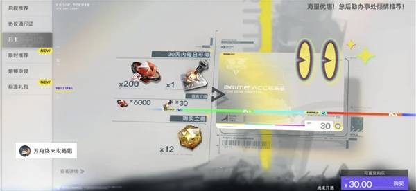 30R购买,购买后可直接获得12衍质源石,后续每日登录领200嵌晶玉(500兑换一抽)和1个应急理智加强剂(回复40体力)