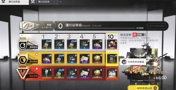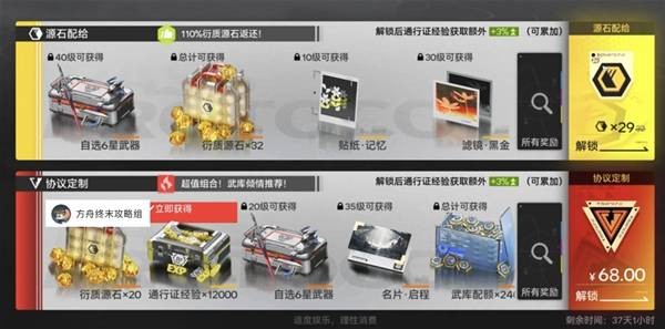 协议定制:充值档,通过68R购买获得,内含更多养成材料+1.2w战令+立即获得20个衍质源石(共计36个源石)+自选6星武器+2400武库配额,比上面两个档位的合起来都多。