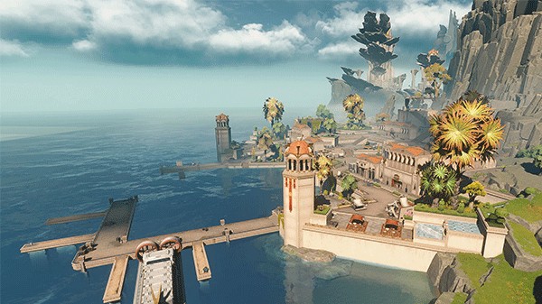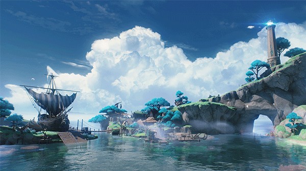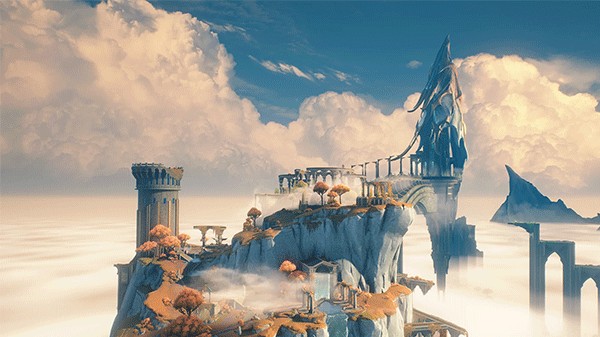 被海雾包围的荒凉岛屿,陡峭的山崖上耸立着巨大的环状造物。
